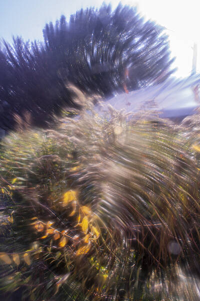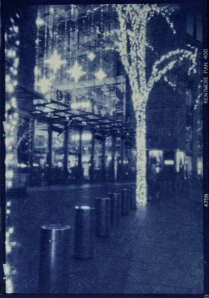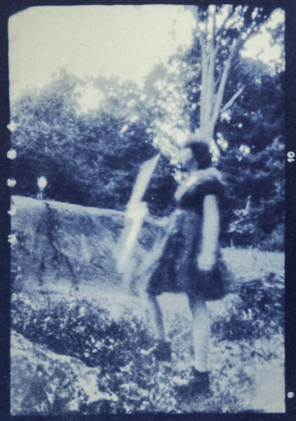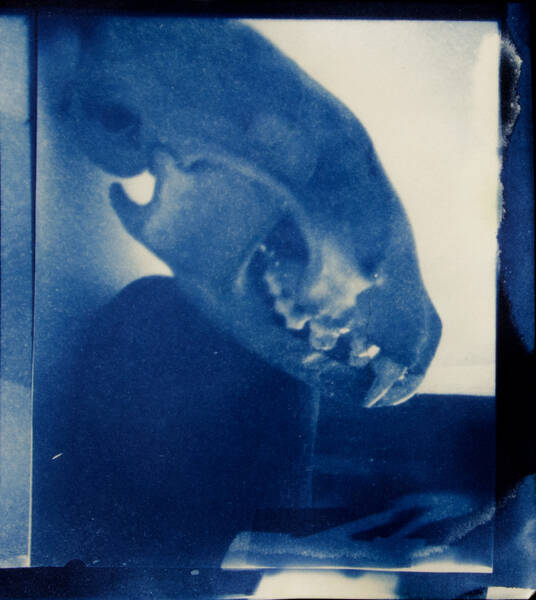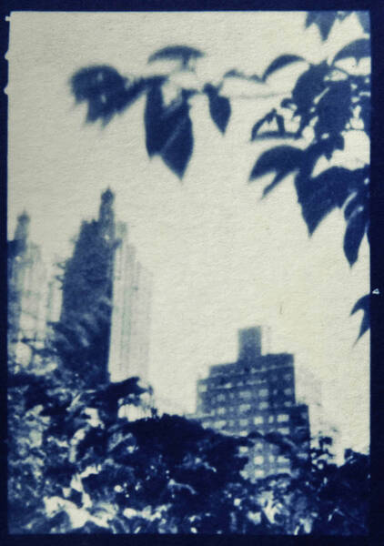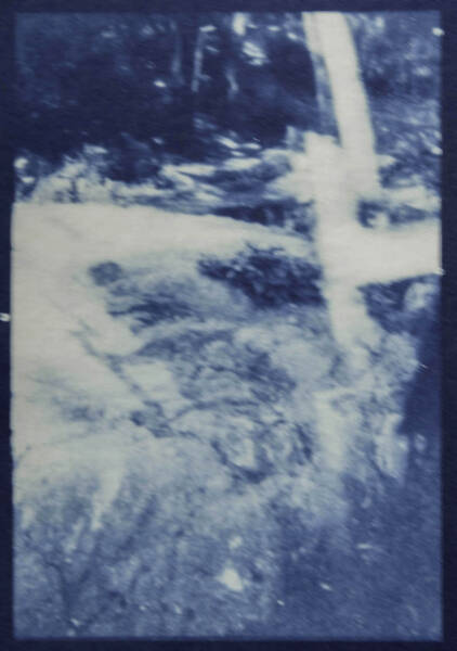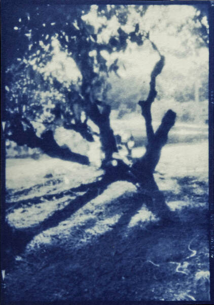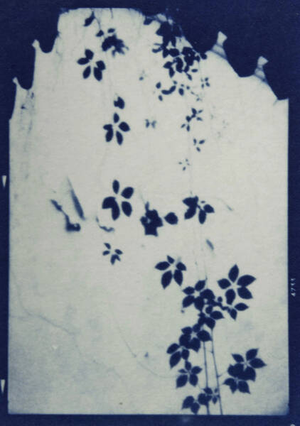 Iron and potassium salts are washed with water, leaving an imprint on the page. With cyanotype printing, the artist has direct contact with the photographic process. Kitchen table chemistry, baking soda, tea, hydrogen peroxide, and vinegar can tone, bleach, darken, and increase contrast.